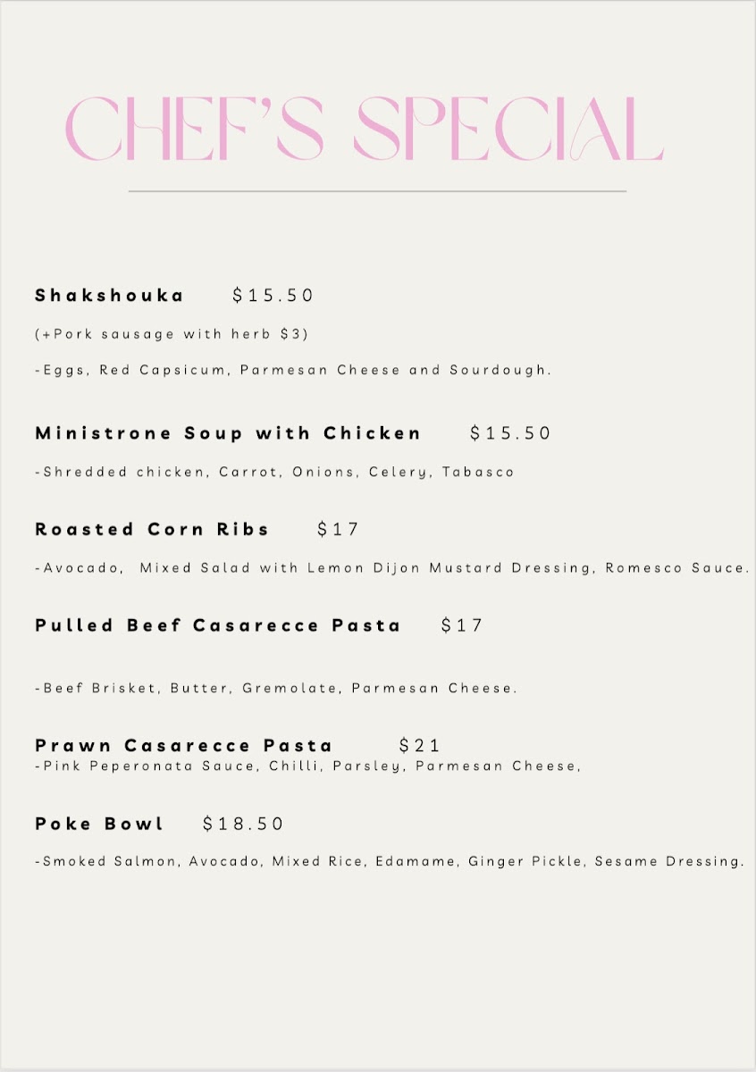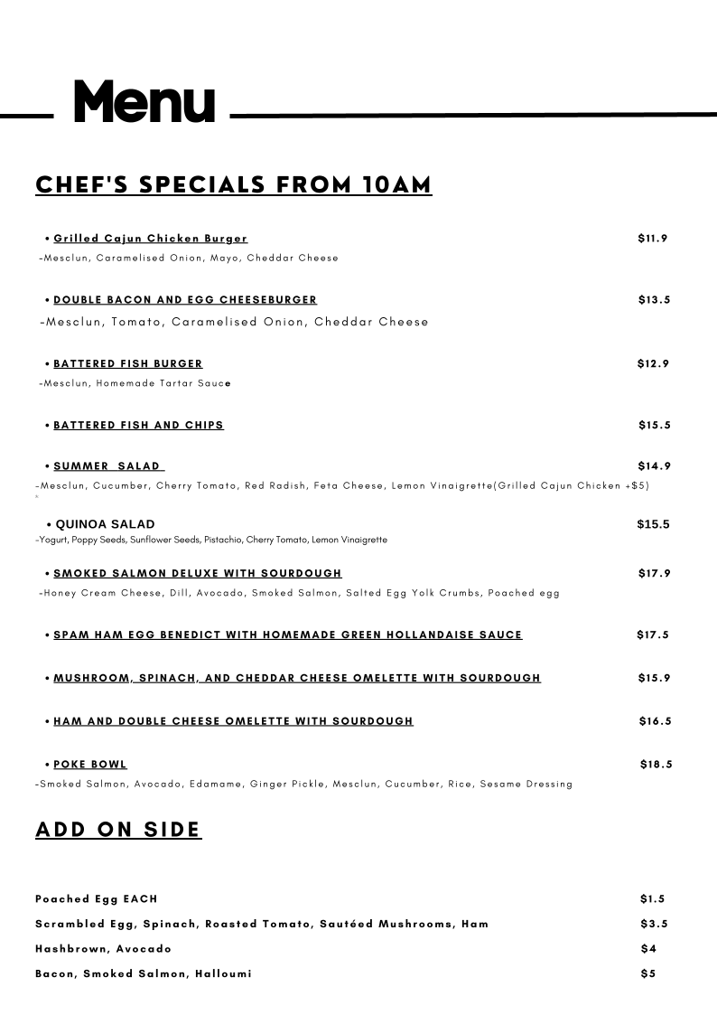 - Chef’s Specials start at 10 AM with standout items like the Double Bacon and Egg Cheeseburger and the refreshing Quinoa Salad. Both promise ample portions to satiate your hunger.